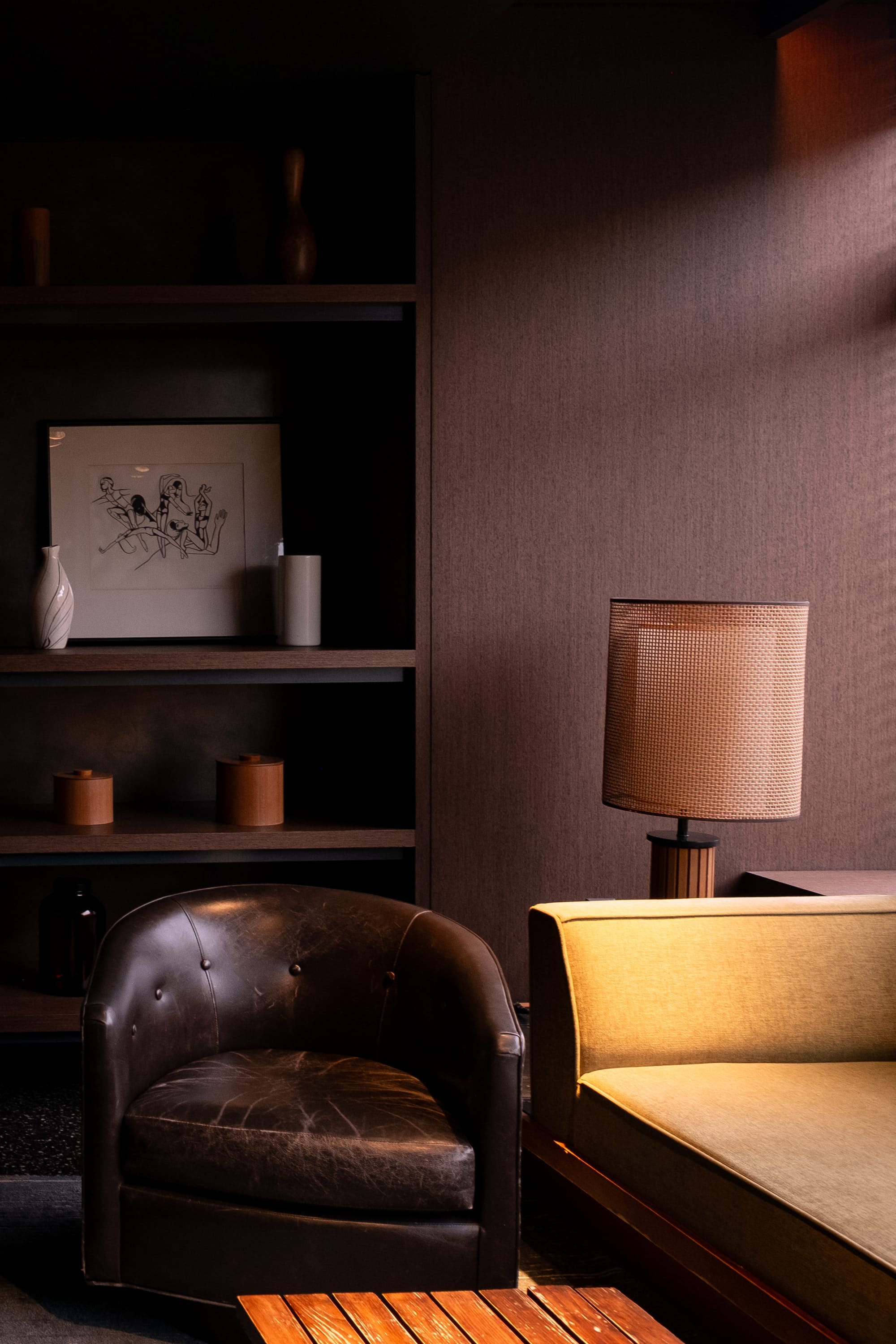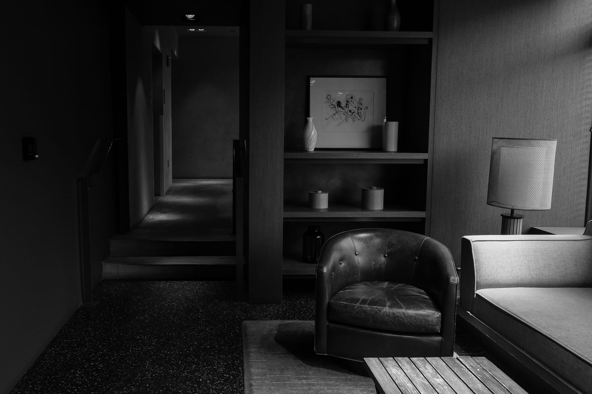 What initially caught my eye was the lived-in furniture and its warm, earthy tones set against the cool, white-speckled black terrazzo floor, with the warm wood walls adding vertical dimension to the space. The main subject is this worn leather chair, but I deliberately included partial views of surrounding furniture—the edge of a sofa and the end of the coffee table. You don't need the whole piece to communicate its presence—just the recognizable attributes that define it. Sometimes just a quarter of a coffee cup is enough to communicate the whole cup's presence.